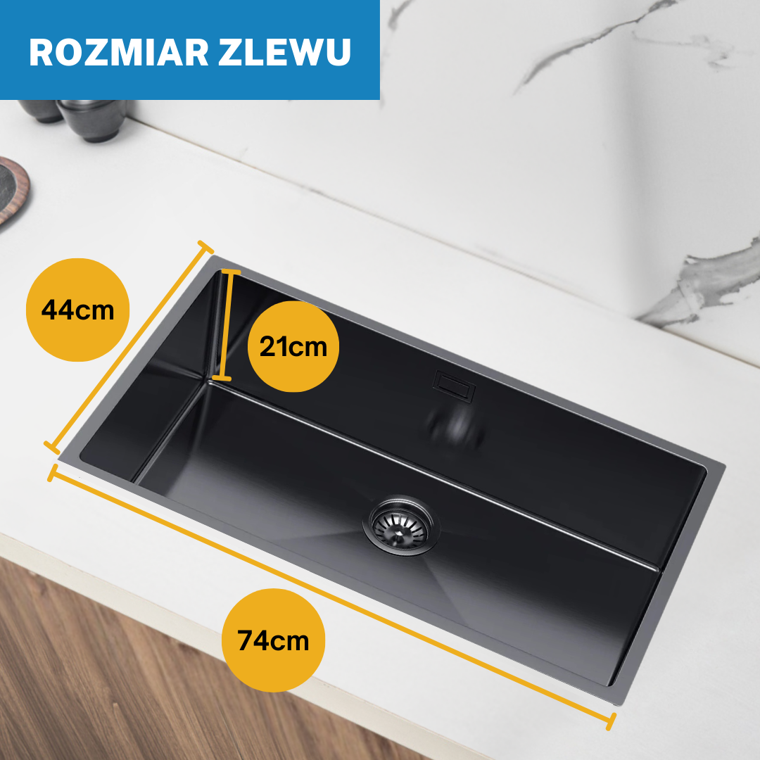 Für Ihre Küche präsentieren wir Ihnen eine einzigartige, moderne große Einzelspüle in eleganter schwarzer PVD-Farbe. Das 74x44 cm große Waschbecken ist die perfekte Wahl für alle, die Wert auf Stil, Funktionalität und Haltbarkeit legen. Das 210mm tiefe Becken bietet Ihnen ausreichend Platz zum Geschirrspülen und Speisenzubereiten. Durch die spezielle PVD-Beschichtung ist die Spüle widerstandsfähig und kratzfest, sodass sie viele Jahre lang wie neu aussieht.