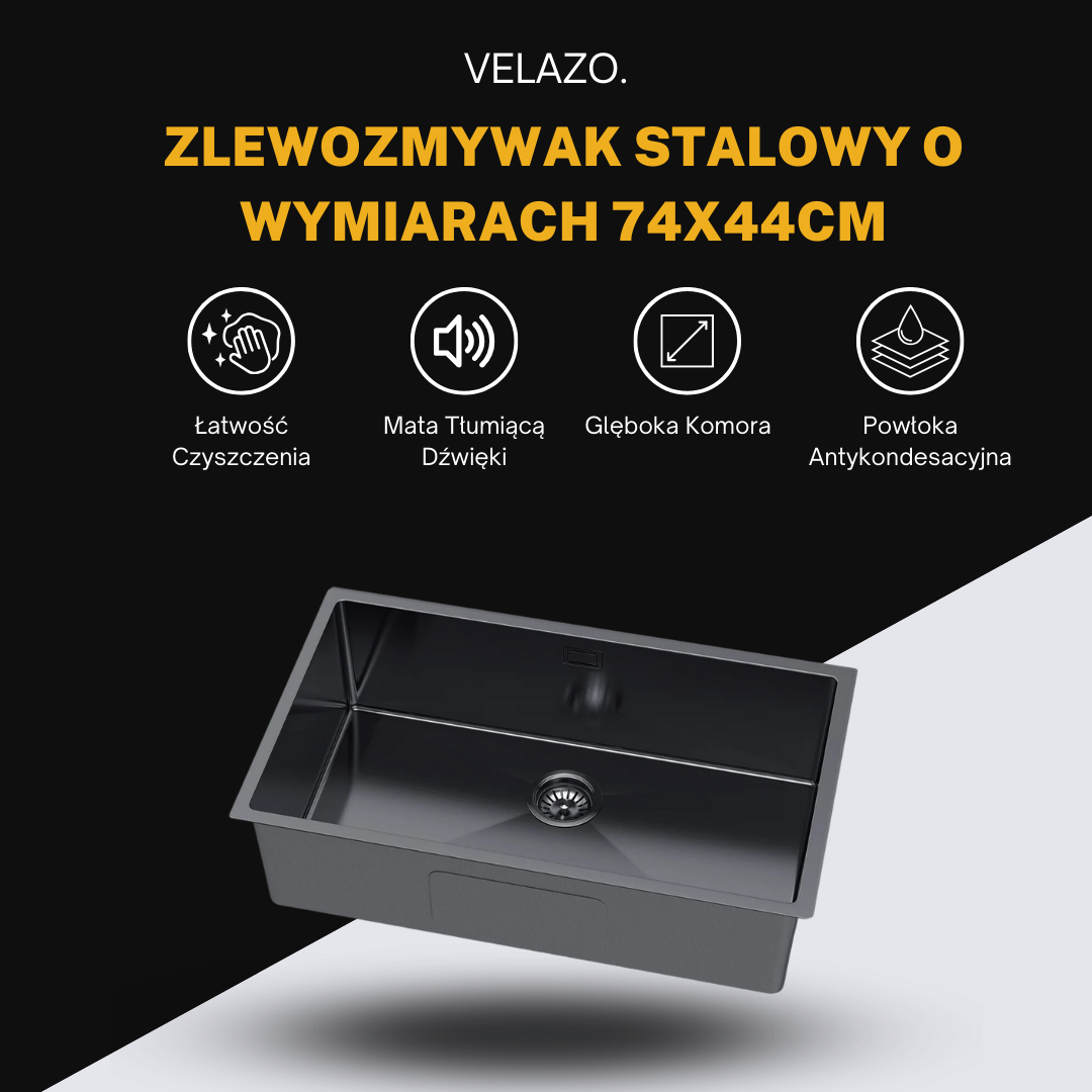 Großes Einzelbecken-Stahlspülbecken – 74 x 44 cm in der Farbe PVD GRAPHITE von VELAZO.
