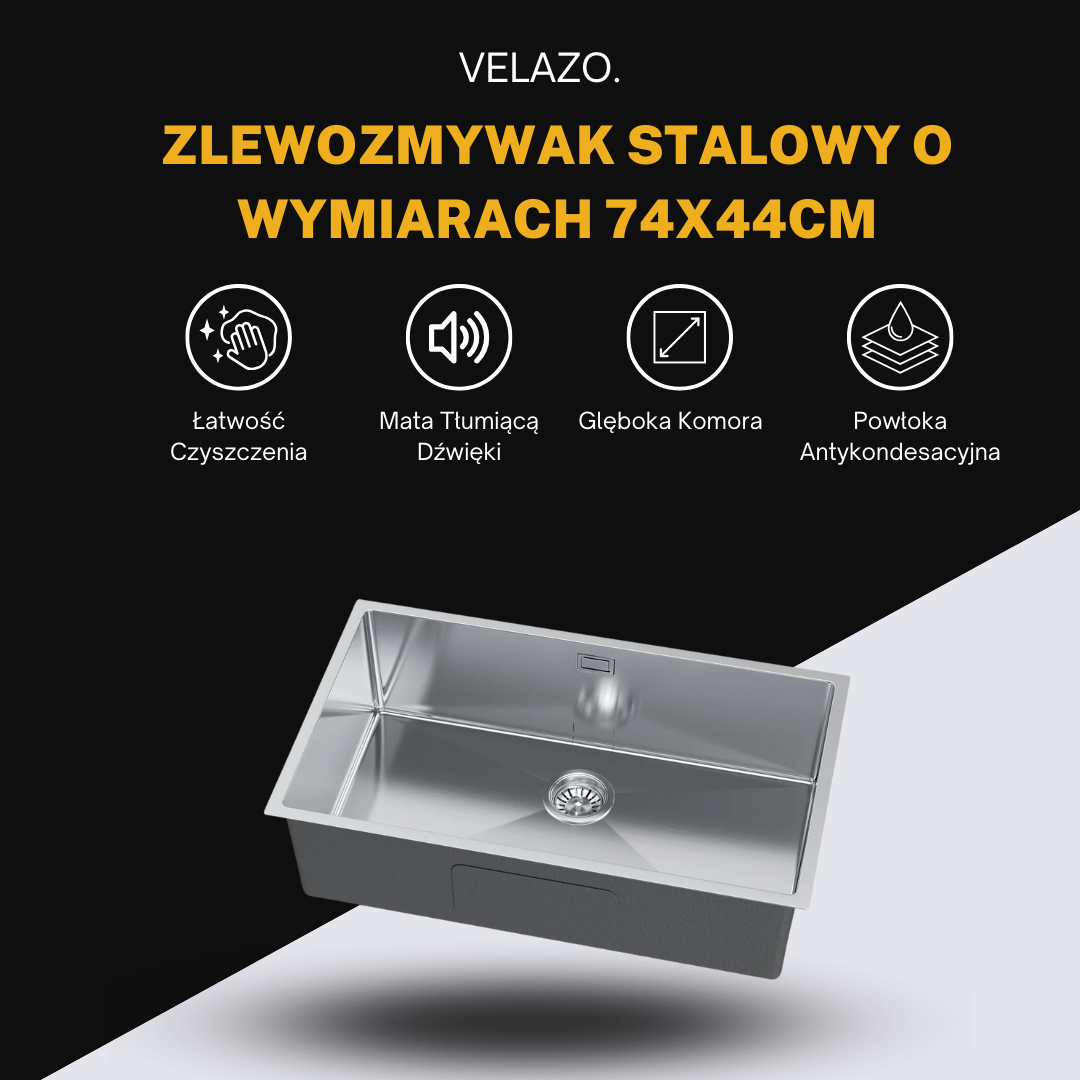 Einzelbecken-Stahlspüle – 74 x 44 cm in der Farbe INOX von VELAZO.