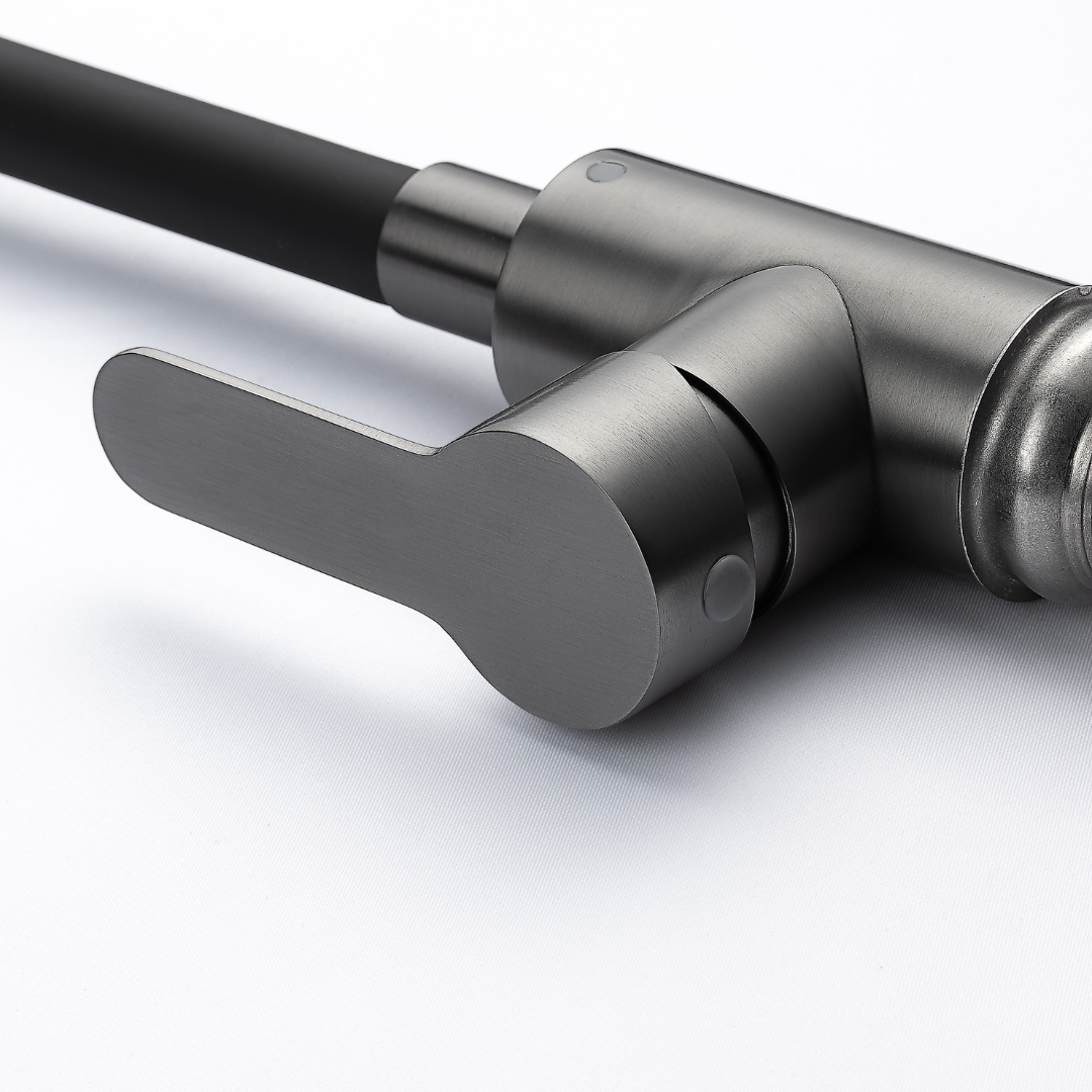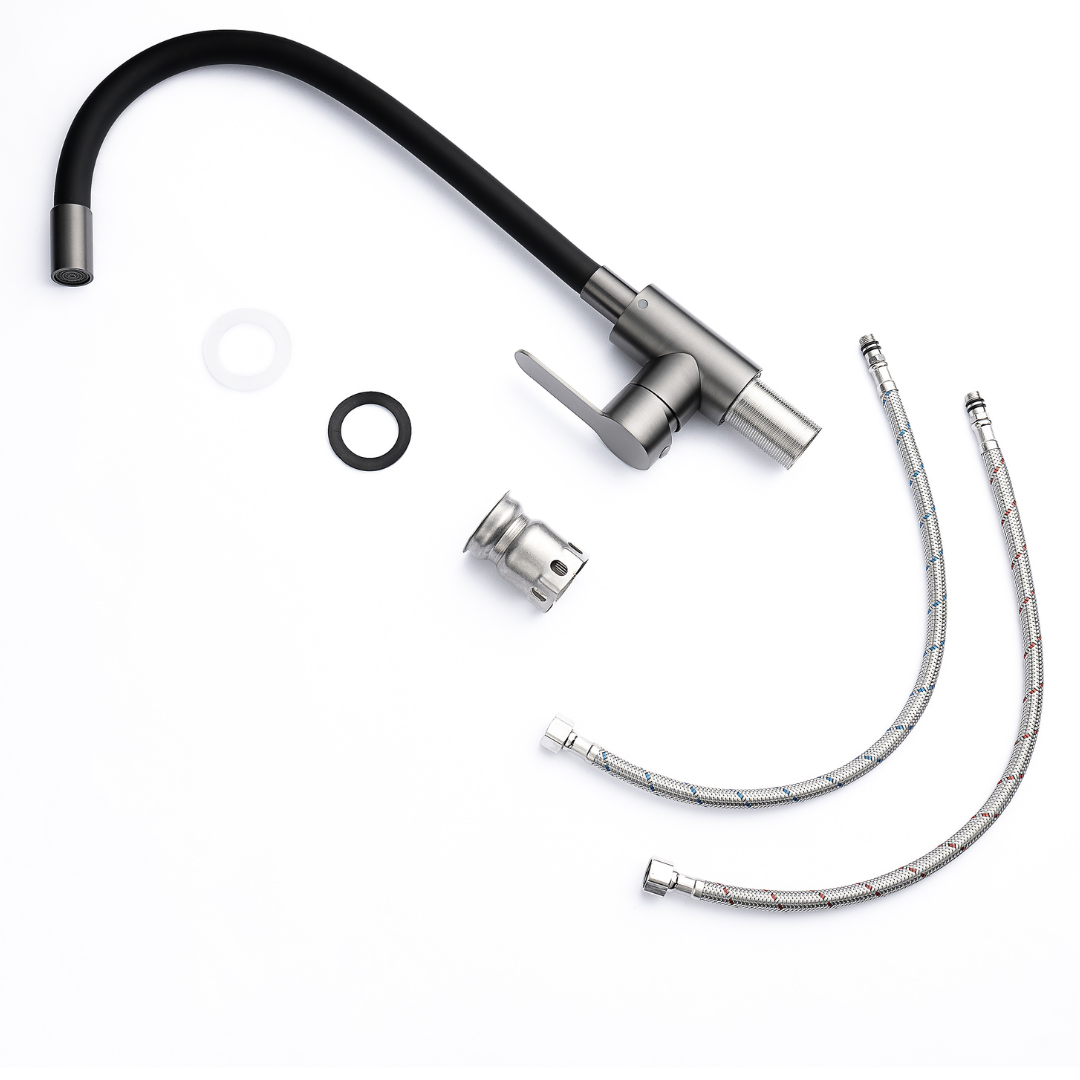 Bateria kuchenna VELAZO.Black Flexi / Grafit łączy nowoczesny design z funkcjonalnością, która ułatwia codzienne prace w kuchni. Elastyczna wylewka z obrotem 360° zapewnia pełną swobodę ruchu – idealna do mycia dużych naczyń, napełniania garnków czy czyszczenia zlewu.