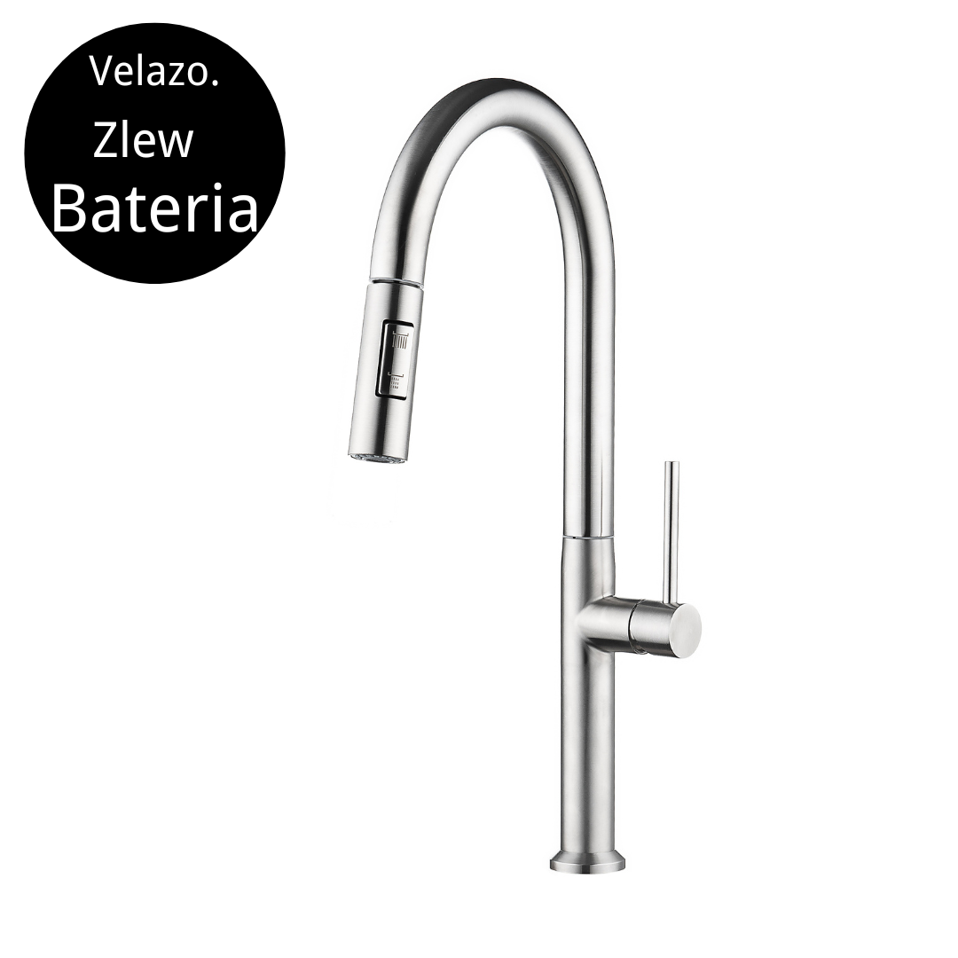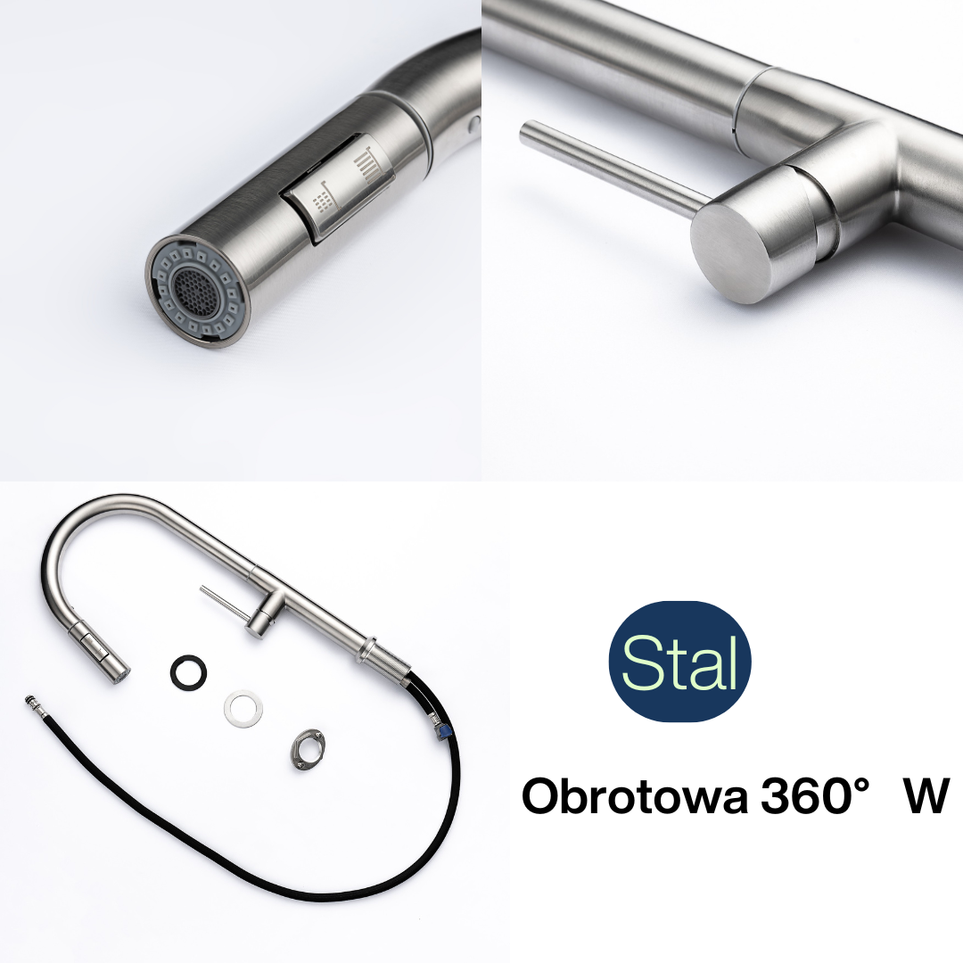 Bateria kuchenna z wyciąganą wylewką Inox – Jednouchwytowa, Obrotowa 360°, Mosiądz, Perlator, Montaż standardowy