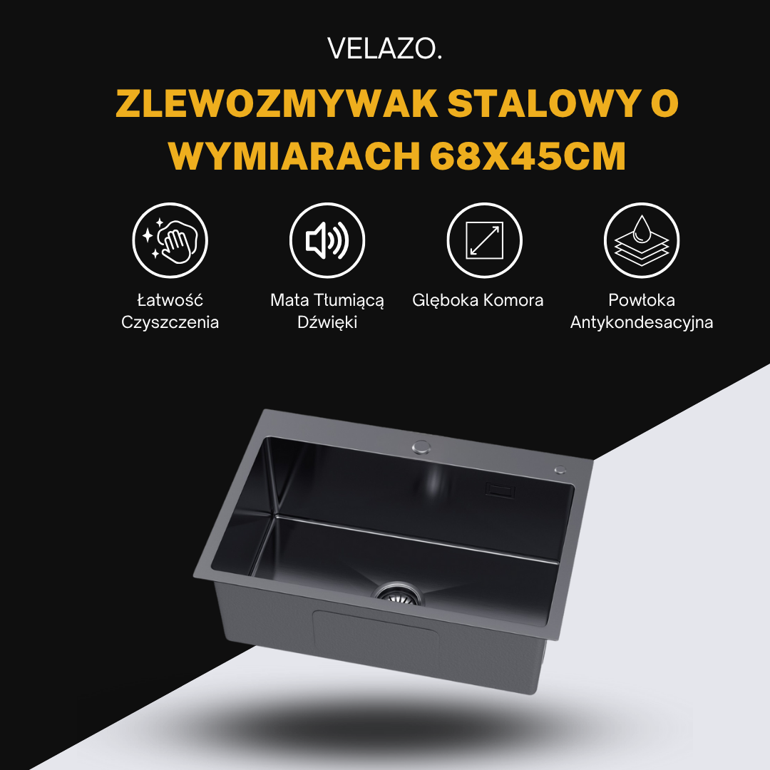 Zlewozmywak stalowy Velazo. 68x45cm w kolorze grafitowym to eleganckie i funkcjonalne rozwiązanie do różnych aranżacji kuchennych