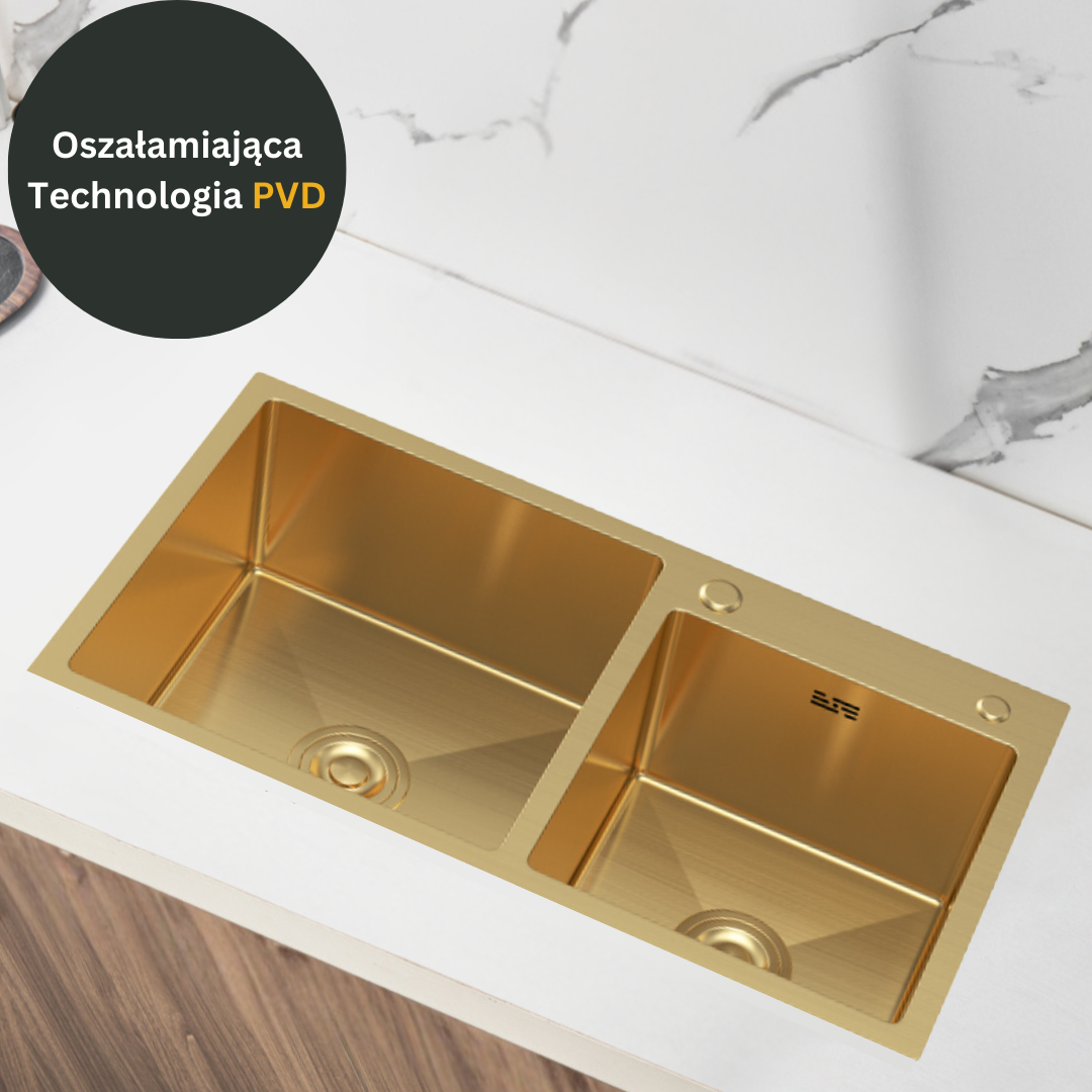 Luksusowy zlewozmywak kuchenny wykonany z wysokiej jakości stali nierdzewnej, pokryty elegancką złotą powłoką PVD. Idealny dla tych, którzy cenią sobie zarówno funkcjonalność, jak i estetykę. Dzięki nowoczesnemu wyglądowi i solidnej konstrukcji, zlewozmywak ten doskonale wpasuje się w każdą nowoczesną kuchnię, dodając jej wyjątkowego charakteru.